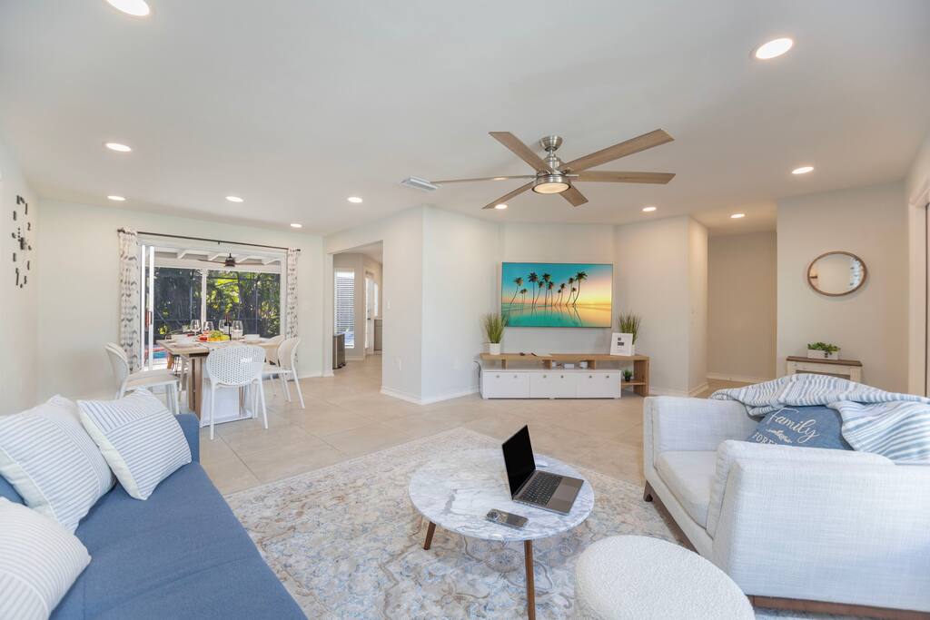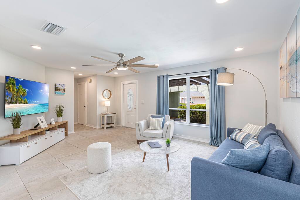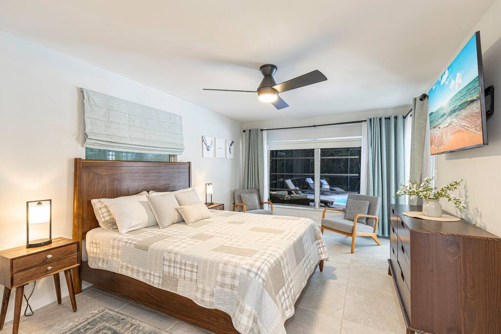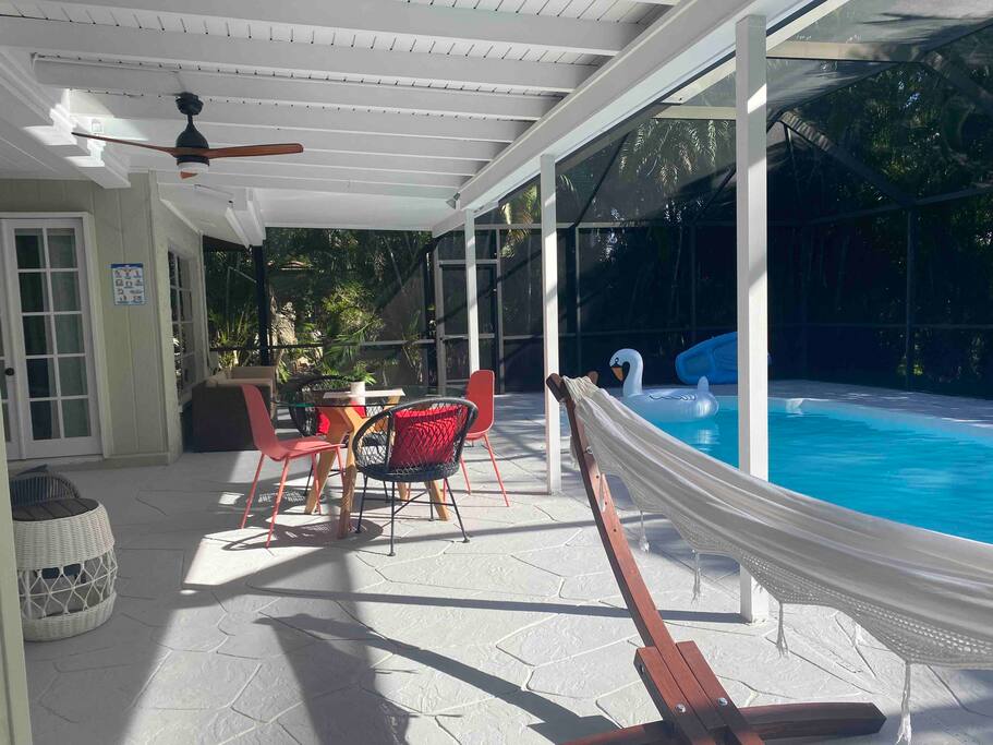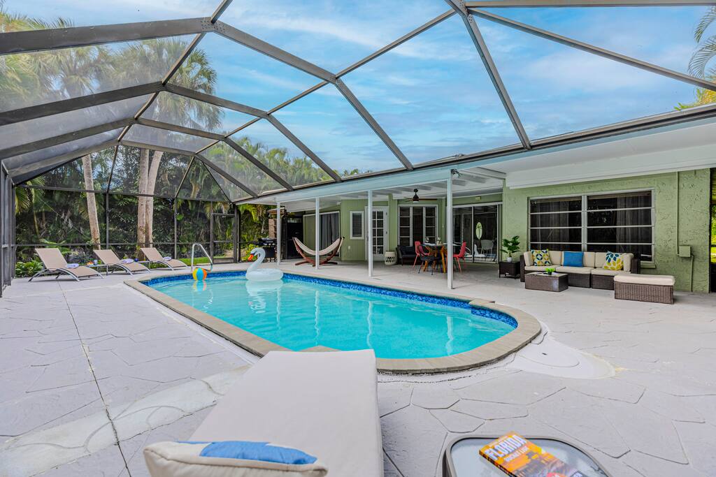 Welcome to your Naples getaway! Our cozy 2-bedroom, 2-bath home has all you need for a memorable stay: • Bedrooms: Two queen beds • Living Area: Two smart TVs, sleeper sofa • Kitchen: Fully equipped for meals • Indoor Dining: Overlooks the pool • Screened Lanai: Outdoor dining, cozy seating, grill • Private Heated Pool: Pool loungers, towels, and beach gear provided • Family-Friendly: Pack ’n Play, mini crib, Wi-Fi, washer/dryer, smart lock • Parking: Driveway for 2 cars Just minutes from beaches, dining, and attractions, our home is perfect for a relaxing or family-friendly stay.